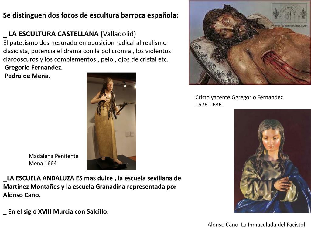 ESCULTURA CASTELLANA: La figura mas representante es Gregorio Fernandez Su obra abarca retablos, pasos procesionales ,imágenes aisladas como el Cristo Yacente LA PIEDAD: La Piedad formaba parte de un paso Que tenia 5 figuras: Cristo ,San Juan , Magdalena y los dos ladrones. En el grupo de Maria y Jesus , la composición rompe el esquema piramidal y crea una composición en diagonal asimétrica. El cuerpo inerte de Jesus sobre las rodillas de Maria Recuerda a la Piedad Rondanini por su expresividad, resaltada por un tratamiento realista acentuado por la policromía y el tratamiento ampuloso de los ropajes. EL CRISTO YACENTE: Por primera vez Cristo aparece sólo , sin formar parte de un conjunto o aislado de la cruz. Es importante el naturalismo con que esta tratado , tanto la anatomía como los pliegues de la sabana . La policromía acentua el patetismo .