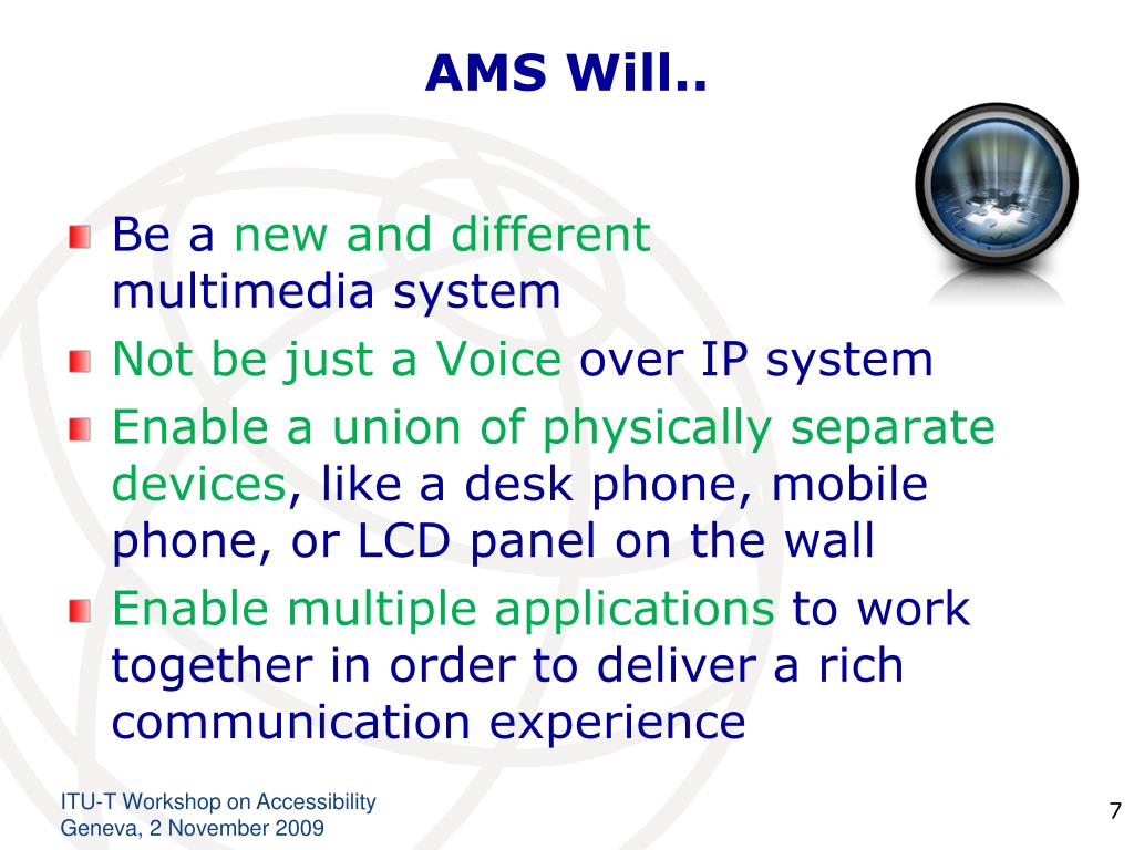 What is AMS? • The Advanced Multimedia Systems (AMS), also known as H.325, is the third-generation multimedia system developed by the ITU • First generation was H.320 (ISDN) • Second generation was H.323 (IP)