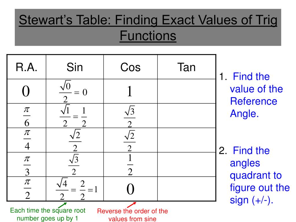 Stewart’s Table: Finding Exact Values of Trig Functions • Find the value of the Reference Angle. • Find the angles quadrant to figure out the sign (+/-). Each time the square root number goes up by 1 Reverse the order of the values from sine
