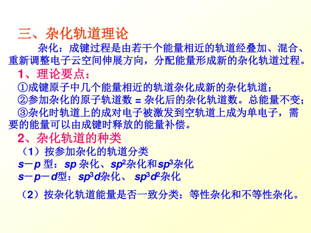 三、杂化轨道理论 杂化:成键过程是由若干个能量相近的轨道经叠加、混合、重新调整电子云空间伸展方向,分配能量形成新的杂化轨道过程。 1、理论要点: ①成键原子中几个能量相近的轨道杂化成新的杂化轨道; ②参加杂化的原子轨道数 = 杂化后的杂化轨道数。总能量不变; ③杂化时轨道上的成对电子被激发到空轨道上成为单电子,需要的能量可以由成键时释放的能量补偿。 2、杂化轨道的种类 (1)按参加杂化的轨道分类 s-p型:sp杂化、sp2杂化和sp3杂化 s-p-d型:sp3d杂化、 sp3d2杂化 (2)按杂化轨道能量是否一致分类:等性杂化和不等性杂化。