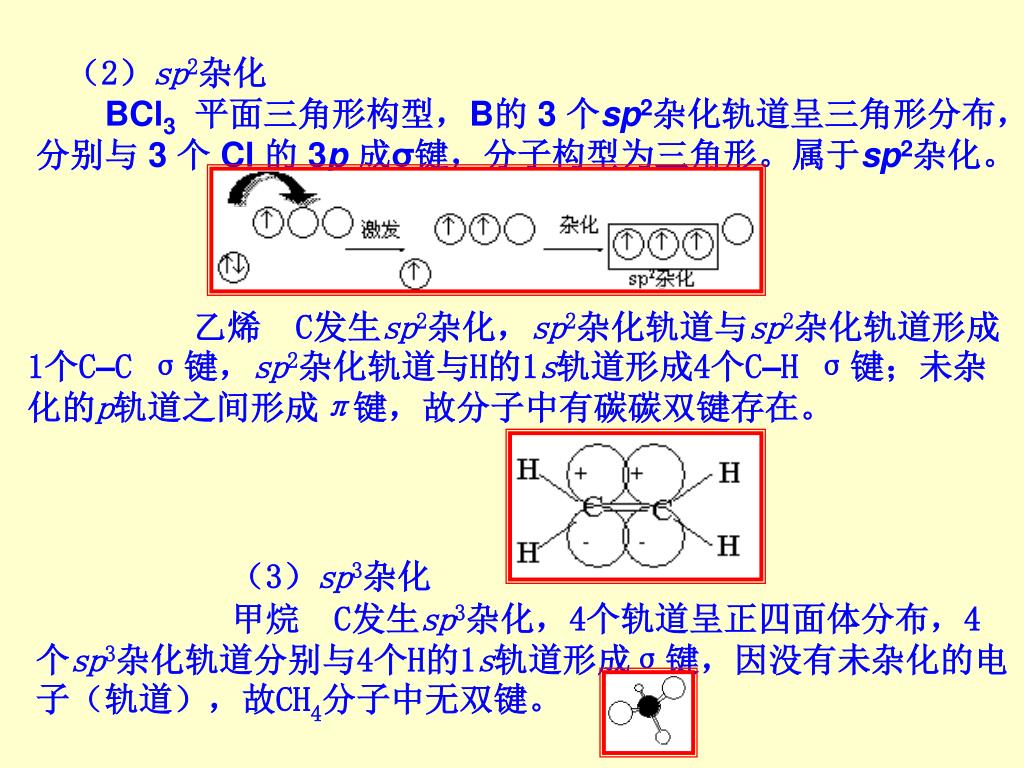 (2)sp2杂化 BCl3平面三角形构型,B的 3 个sp2杂化轨道呈三角形分布,分别与 3 个 Cl 的 3p成σ键,分子构型为三角形。属于sp2杂化。 乙烯 C发生sp2杂化,sp2杂化轨道与sp2杂化轨道形成1个C–C σ键,sp2杂化轨道与H的1s轨道形成4个C–H σ键;未杂化的p轨道之间形成π键,故分子中有碳碳双键存在。 (3)sp3杂化 甲烷 C发生sp3杂化,4个轨道呈正四面体分布,4个sp3杂化轨道分别与4个H的1s轨道形成σ键,因没有未杂化的电子(轨道),故CH4分子中无双键。