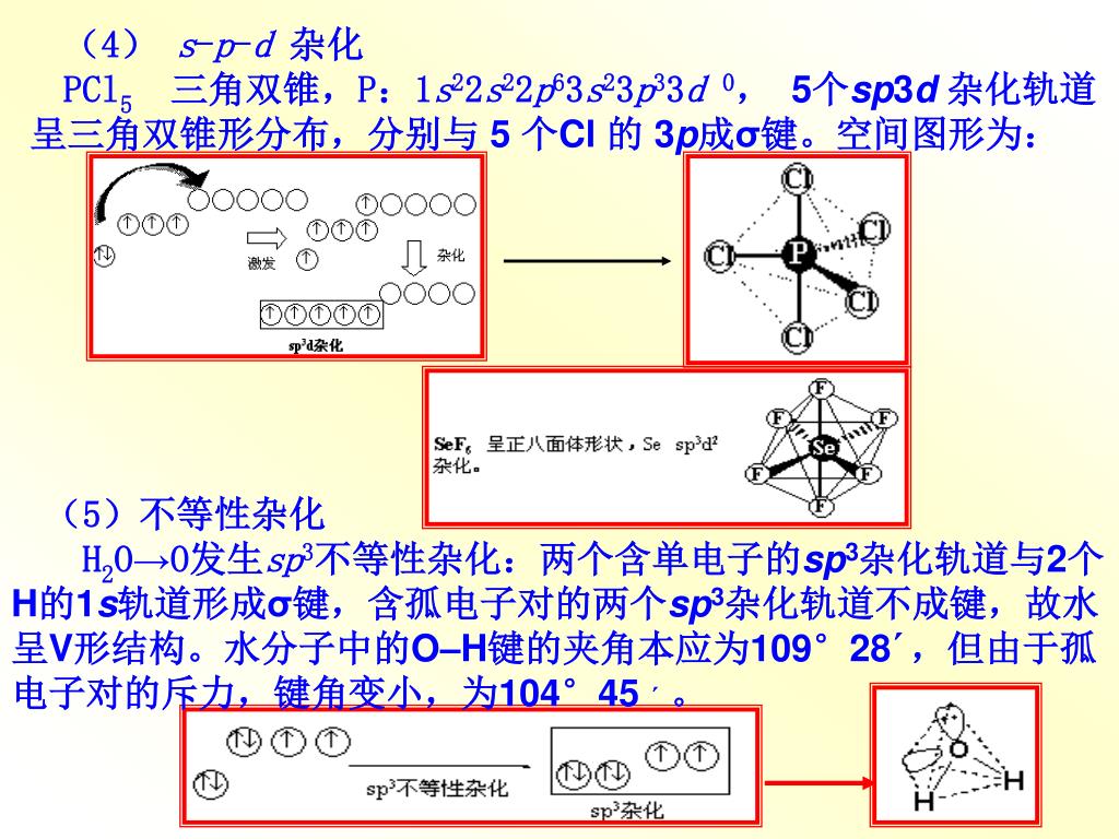 (4) s-p-d杂化 PCl5三角双锥,P:1s22s22p63s23p33d 0, 5个sp3d杂化轨道呈三角双锥形分布,分别与 5 个Cl 的 3p成σ键。空间图形为: (5)不等性杂化 H2O→O发生sp3不等性杂化:两个含单电子的sp3杂化轨道与2个H的1s轨道形成σ键,含孤电子对的两个sp3杂化轨道不成键,故水呈V形结构。水分子中的O–H键的夹角本应为109°28´,但由于孤电子对的斥力,键角变小,为104°45 ´。