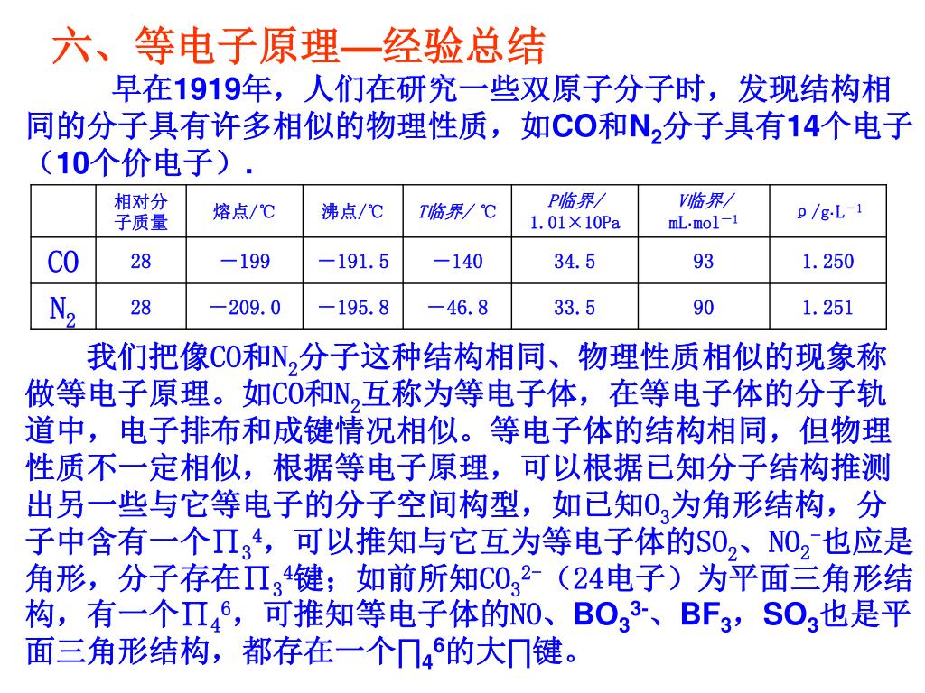 六、等电子原理—经验总结 早在1919年,人们在研究一些双原子分子时,发现结构相同的分子具有许多相似的物理性质,如CO和N2分子具有14个电子(10个价电子). 我们把像CO和N2分子这种结构相同、物理性质相似的现象称做等电子原理。如CO和N2互称为等电子体,在等电子体的分子轨道中,电子排布和成键情况相似。等电子体的结构相同,但物理性质不一定相似,根据等电子原理,可以根据已知分子结构推测出另一些与它等电子的分子空间构型,如已知O3为角形结构,分子中含有一个∏34,可以推知与它互为等电子体的SO2、NO2-也应是角形,分子存在∏34键;如前所知CO32-(24电子)为平面三角形结构,有一个∏46,可推知等电子体的NO、BO33-、BF3,SO3也是平面三角形结构,都存在一个∏46的大∏键。