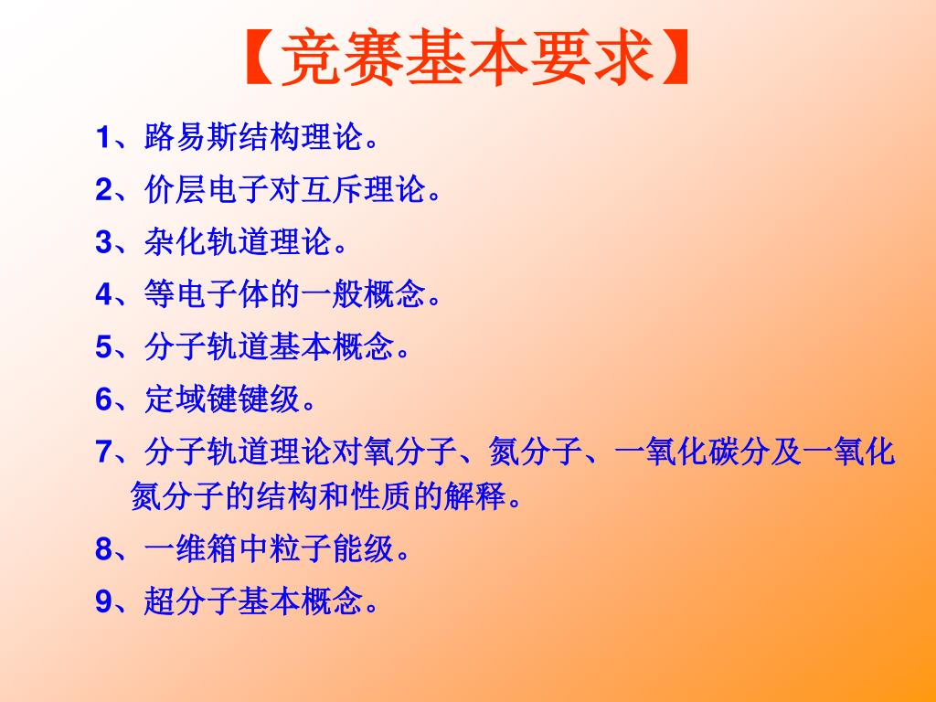【竞赛基本要求】 1、路易斯结构理论。 2、价层电子对互斥理论。 3、杂化轨道理论。 4、等电子体的一般概念。 5、分子轨道基本概念。 6、定域键键级。 7、分子轨道理论对氧分子、氮分子、一氧化碳分及一氧化氮分子的结构和性质的解释。 8、一维箱中粒子能级。 9、超分子基本概念。