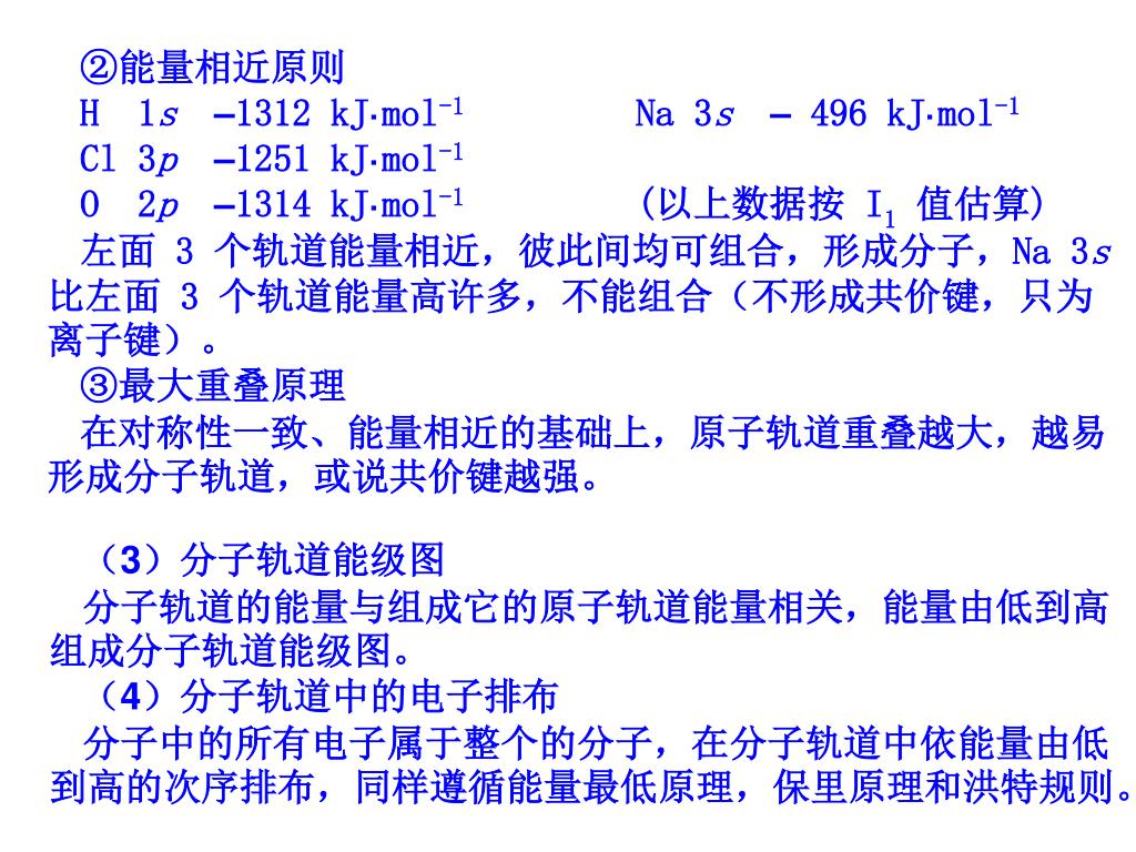 ②能量相近原则 H 1s–1312 kJ·mol-1Na 3s– 496 kJ·mol-1 Cl 3p–1251 kJ·mol-1 O 2p–1314 kJ·mol-1(以上数据按 I1值估算) 左面 3 个轨道能量相近,彼此间均可组合,形成分子,Na 3s比左面 3 个轨道能量高许多,不能组合(不形成共价键,只为离子键)。 ③最大重叠原理 在对称性一致、能量相近的基础上,原子轨道重叠越大,越易形成分子轨道,或说共价键越强。 (3)分子轨道能级图 分子轨道的能量与组成它的原子轨道能量相关,能量由低到高组成分子轨道能级图。 (4)分子轨道中的电子排布 分子中的所有电子属于整个的分子,在分子轨道中依能量由低到高的次序排布,同样遵循能量最低原理,保里原理和洪特规则。