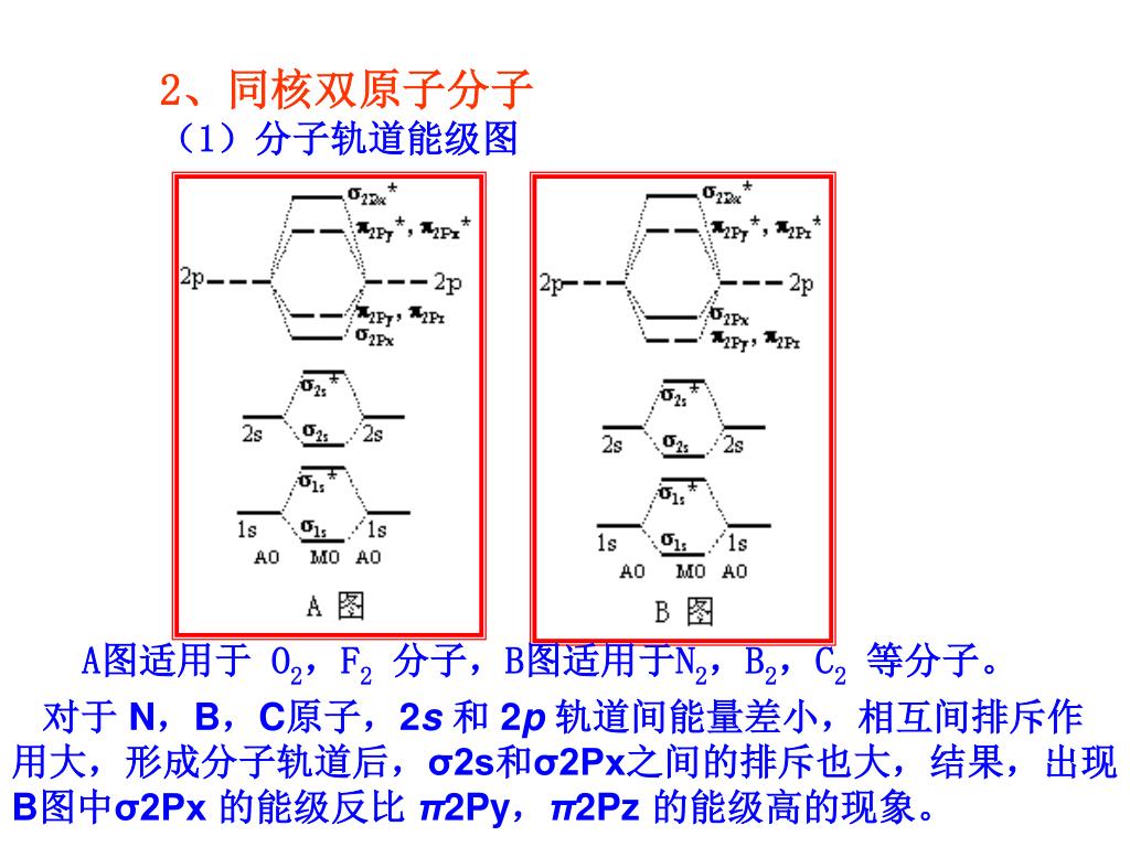 2、同核双原子分子 (1)分子轨道能级图 A图适用于 O2,F2分子,B图适用于N2,B2,C2等分子。 对于 N,B,C原子,2s和 2p轨道间能量差小,相互间排斥作用大,形成分子轨道后,σ2s和σ2Px之间的排斥也大,结果,出现 B图中σ2Px 的能级反比 π2Py,π2Pz 的能级高的现象。