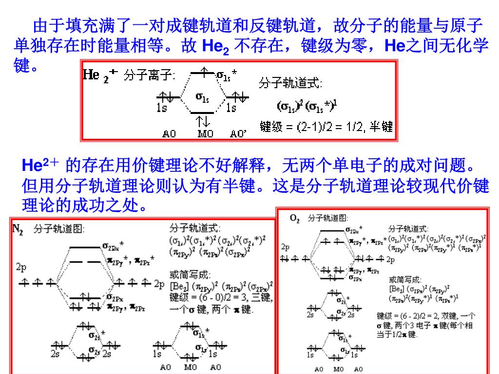 由于填充满了一对成键轨道和反键轨道,故分子的能量与原子单独存在时能量相等。故 He2不存在,键级为零,He之间无化学键。 He2+ 的存在用价键理论不好解释,无两个单电子的成对问题。但用分子轨道理论则认为有半键。这是分子轨道理论较现代价键理论的成功之处。