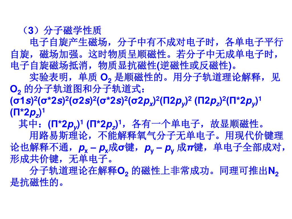 (3)分子磁学性质 电子自旋产生磁场,分子中有不成对电子时,各单电子平行自旋,磁场加强。这时物质呈顺磁性。若分子中无成单电子时,电子自旋磁场抵消,物质显抗磁性(逆磁性或反磁性)。 实验表明,单质 O2是顺磁性的。用分子轨道理论解释,见 O2的分子轨道图和分子轨道式:(σ1s)2(σ*2s)2(σ2s)2(σ*2s)2(σ2px)2(Π2py)2 (Π2pz)2(Π*2py)1 (Π*2pz)1 其中:(Π*2py)1 (Π*2pz)1,各有一个单电子,故显顺磁性。 用路易斯理论,不能解释氧气分子无单电子。用现代价键理论也解释不通,px – px成σ键,py – py成π键,单电子全部成对,形成共价键,无单电子。 分子轨道理论在解释O2的磁性上非常成功。同理可推出N2是抗磁性的。