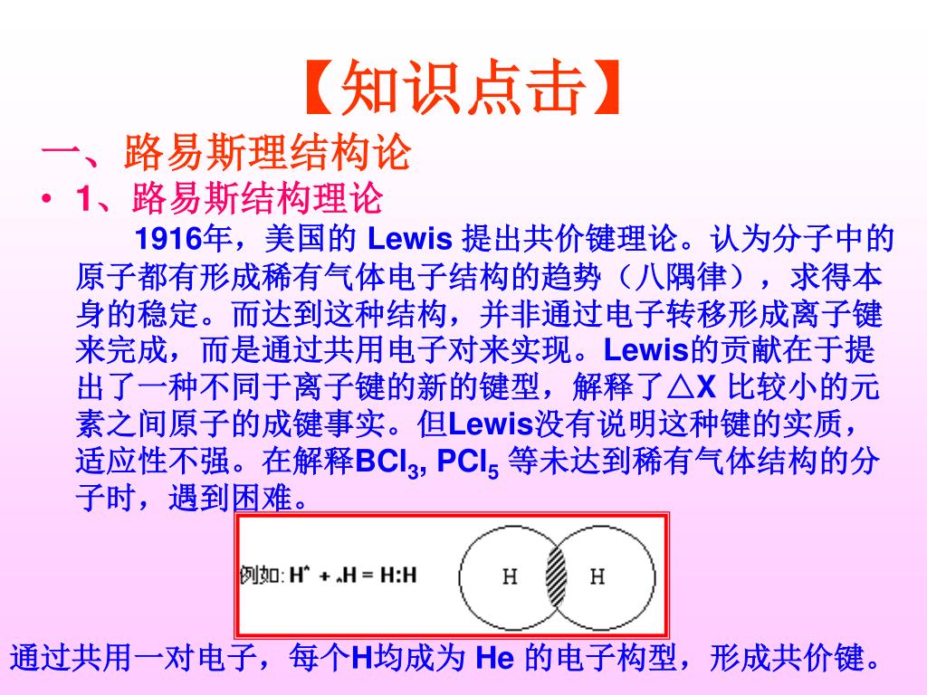 【知识点击】 一、路易斯理结构论 • 1、路易斯结构理论 1916年,美国的 Lewis 提出共价键理论。认为分子中的原子都有形成稀有气体电子结构的趋势(八隅律),求得本身的稳定。而达到这种结构,并非通过电子转移形成离子键来完成,而是通过共用电子对来实现。Lewis的贡献在于提出了一种不同于离子键的新的键型,解释了△X 比较小的元素之间原子的成键事实。但Lewis没有说明这种键的实质,适应性不强。在解释BCl3, PCl5等未达到稀有气体结构的分子时,遇到困难。 通过共用一对电子,每个H均成为 He 的电子构型,形成共价键。