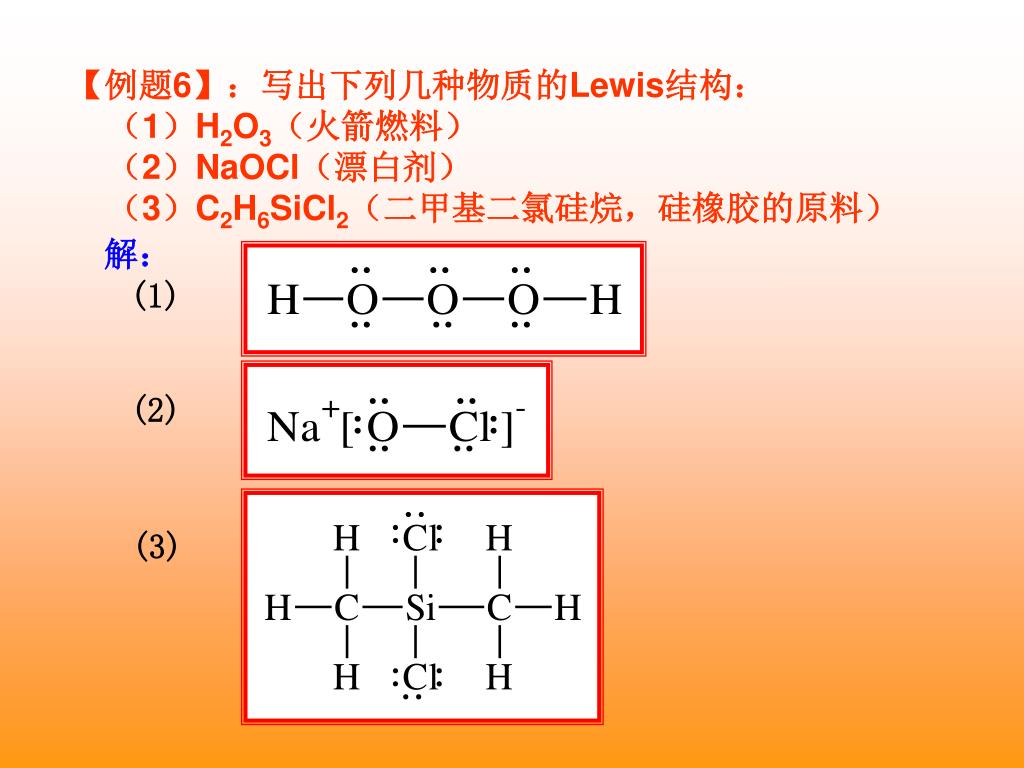 【例题6】:写出下列几种物质的Lewis结构: (1)H2O3(火箭燃料) (2)NaOCl(漂白剂) (3)C2H6SiCl2(二甲基二氯硅烷,硅橡胶的原料) 解: (1) (2) (3)