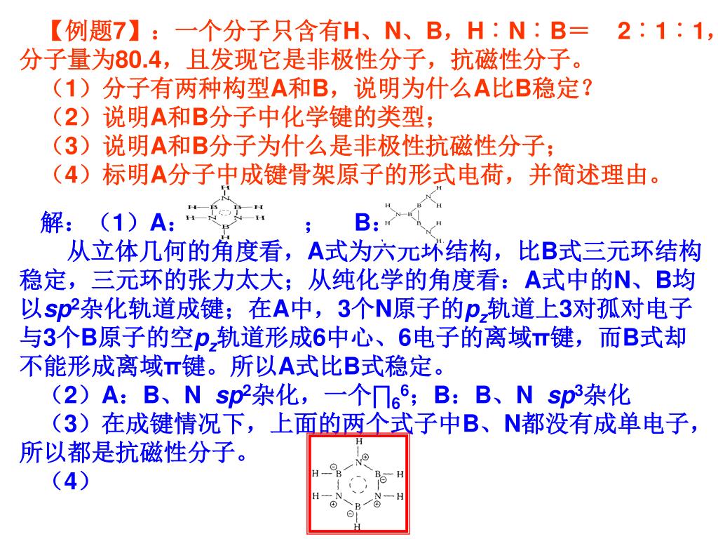 【例题7】:一个分子只含有H、N、B,H︰N︰B= 2︰1︰1,分子量为80.4,且发现它是非极性分子,抗磁性分子。 (1)分子有两种构型A和B,说明为什么A比B稳定? (2)说明A和B分子中化学键的类型; (3)说明A和B分子为什么是非极性抗磁性分子; (4)标明A分子中成键骨架原子的形式电荷,并简述理由。 解:(1)A: ; B: 从立体几何的角度看,A式为六元环结构,比B式三元环结构稳定,三元环的张力太大;从纯化学的角度看:A式中的N、B均以sp2杂化轨道成键;在A中,3个N原子的pz轨道上3对孤对电子与3个B原子的空pz轨道形成6中心、6电子的离域π键,而B式却不能形成离域π键。所以A式比B式稳定。 (2)A:B、N sp2杂化,一个∏66;B:B、N sp3杂化 (3)在成键情况下,上面的两个式子中B、N都没有成单电子,所以都是抗磁性分子。 (4)