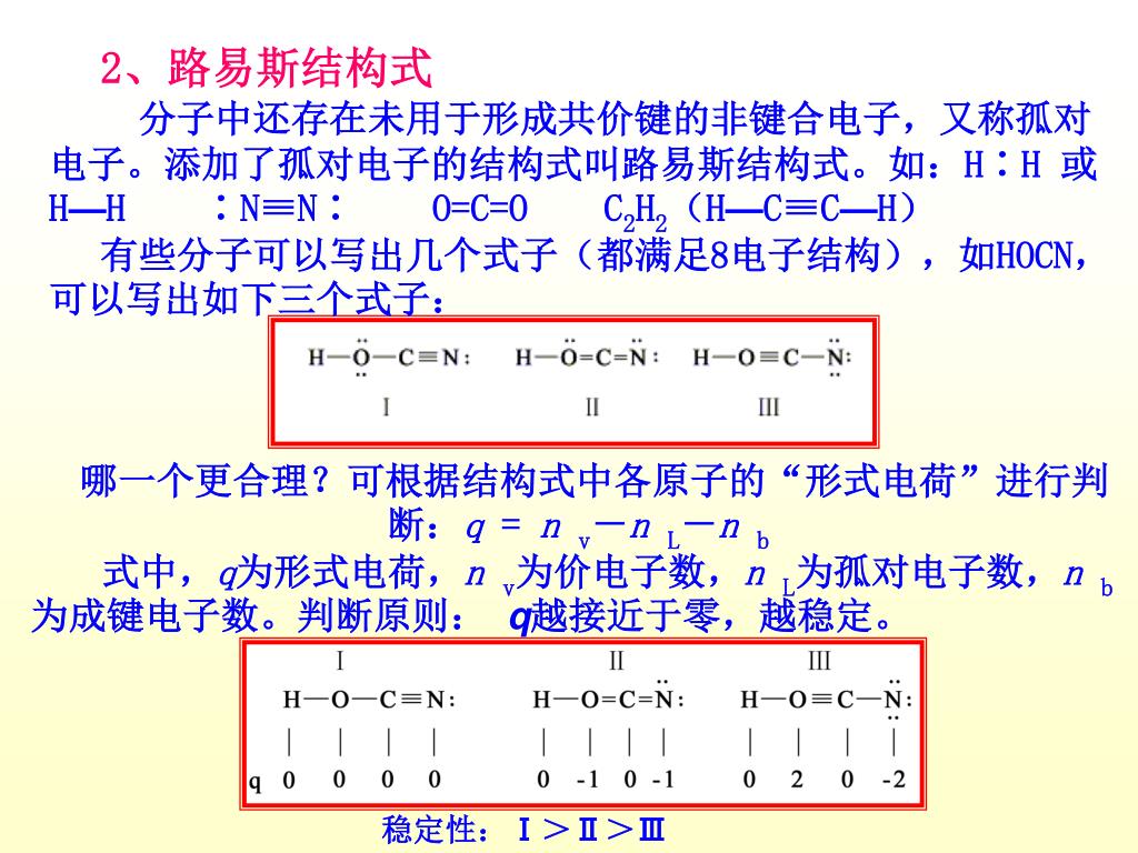 2、路易斯结构式 分子中还存在未用于形成共价键的非键合电子,又称孤对电子。添加了孤对电子的结构式叫路易斯结构式。如:H∶H 或 H—H ∶N≡N∶ O=C=O C2H2(H—C≡C—H) 有些分子可以写出几个式子(都满足8电子结构),如HOCN,可以写出如下三个式子: 哪一个更合理?可根据结构式中各原子的“形式电荷”进行判断:q = n v-n L-n b 式中,q为形式电荷,nv为价电子数,n L为孤对电子数,nb为成键电子数。判断原则: q越接近于零,越稳定。 稳定性:Ⅰ>Ⅱ>Ⅲ