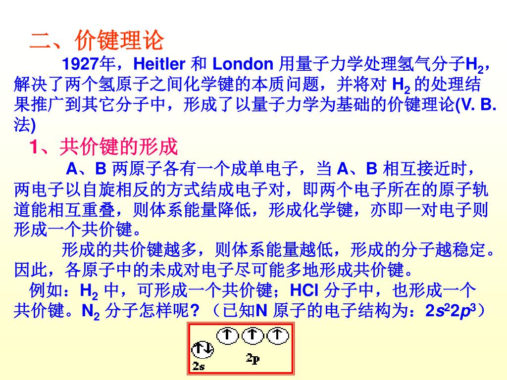 二、价键理论 1927年,Heitler 和 London 用量子力学处理氢气分子H2,解决了两个氢原子之间化学键的本质问题,并将对 H2 的处理结果推广到其它分子中,形成了以量子力学为基础的价键理论(V. B. 法) 1、共价键的形成 A、B 两原子各有一个成单电子,当 A、B 相互接近时,两电子以自旋相反的方式结成电子对,即两个电子所在的原子轨道能相互重叠,则体系能量降低,形成化学键,亦即一对电子则形成一个共价键。 形成的共价键越多,则体系能量越低,形成的分子越稳定。因此,各原子中的未成对电子尽可能多地形成共价键。 例如:H2中,可形成一个共价键;HCl 分子中,也形成一个共价键。N2分子怎样呢? (已知N 原子的电子结构为:2s22p3)