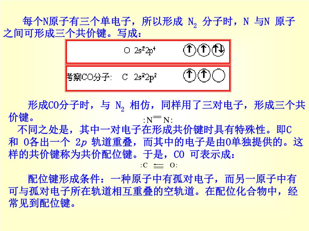:N N: :C O: 每个N原子有三个单电子,所以形成 N2分子时,N 与N 原子之间可形成三个共价键。写成: 形成CO分子时,与 N2相仿,同样用了三对电子,形成三个共价键。 不同之处是,其中一对电子在形成共价键时具有特殊性。即C 和 O各出一个 2p轨道重叠,而其中的电子是由O单独提供的。这样的共价键称为共价配位键。于是,CO 可表示成: 配位键形成条件:一种原子中有孤对电子,而另一原子中有可与孤对电子所在轨道相互重叠的空轨道。在配位化合物中,经常见到配位键。