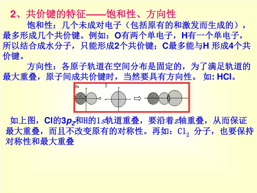 2、共价键的特征——饱和性、方向性 饱和性:几个未成对电子(包括原有的和激发而生成的),最多形成几个共价键。例如:O有两个单电子,H有一个单电子,所以结合成水分子,只能形成2个共价键;C最多能与H 形成4个共价键。 方向性:各原子轨道在空间分布是固定的,为了满足轨道的最大重叠,原子间成共价键时,当然要具有方向性。 如: HCl。 如上图,Cl的3pZ和H的1s轨道重叠,要沿着z轴重叠,从而保证最大重叠,而且不改变原有的对称性。再如:Cl2分子,也要保持对称性和最大重叠