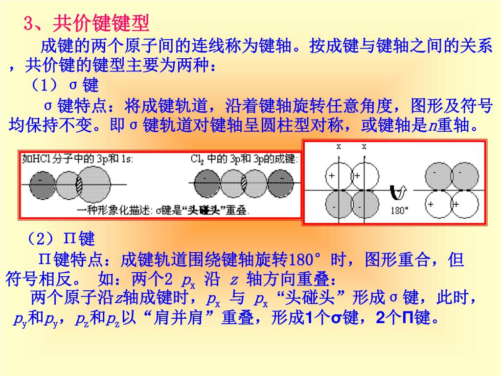 3、共价键键型 成键的两个原子间的连线称为键轴。按成键与键轴之间的关系,共价键的键型主要为两种: (1)σ键 σ键特点:将成键轨道,沿着键轴旋转任意角度,图形及符号均保持不变。即σ键轨道对键轴呈圆柱型对称,或键轴是n重轴。 (2)Π键 Π键特点:成键轨道围绕键轴旋转180°时,图形重合,但符号相反。 如:两个2 px沿z 轴方向重叠: 两个原子沿z轴成键时,px与 px“头碰头”形成σ键,此时,py和py,pz和pz以“肩并肩”重叠,形成1个σ键,2个Π键。