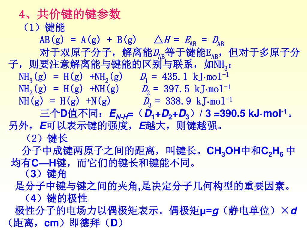4、共价键的键参数 (1)键能 AB(g) = A(g) + B(g) △H = EAB = DAB 对于双原子分子,解离能DAB等于键能EAB,但对于多原子分子,则要注意解离能与键能的区别与联系,如NH3: NH3(g) = H(g) +NH2(g) D1 = 435.1 kJ·mol-1 NH2(g) = H(g) +NH(g) D2 = 397.5 kJ·mol-1 NH(g) = H(g) +N(g) D3 = 338.9 kJ·mol-1 三个D值不同:EN-H=(D1+D2+D3)/ 3 =390.5 kJ·mol-1。另外,E可以表示键的强度,E越大,则键越强。 (2)键长 分子中成键两原子之间的距离,叫键长。CH3OH中和C2H6 中均有C—H键,而它们的键长和键能不同。 (3)键角 是分子中键与键之间的夹角,是决定分子几何构型的重要因素。 (4)键的极性 极性分子的电场力以偶极矩表示。偶极矩μ=g(静电单位)×d(距离,cm)即德拜(D)