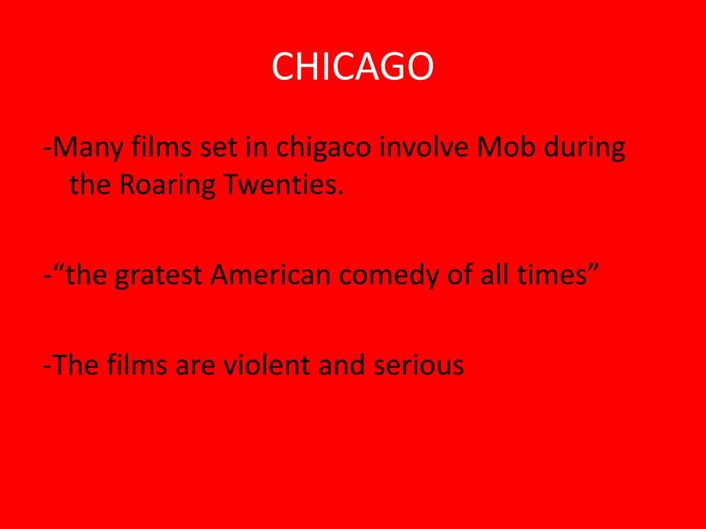 CHICAGO -Manyfilms set in chigaco involve Mobduring the RoaringTwenties. -“the gratest American comedy ofalltimes” -The films are violent and serious