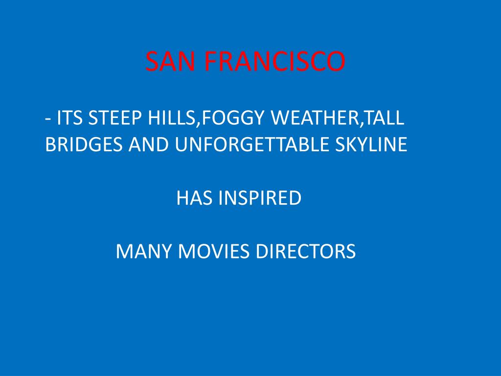 SAN FRANCISCO - ITS STEEP HILLS,FOGGY WEATHER,TALL BRIDGES AND UNFORGETTABLE SKYLINE HAS INSPIRED MANY MOVIES DIRECTORS