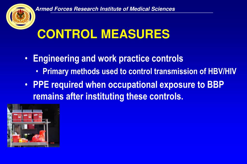 CONTROL MEASURES • Engineering and work practice controls • Primary methods used to control transmission of HBV/HIV • PPE required when occupational exposure to BBP remains after instituting these controls.