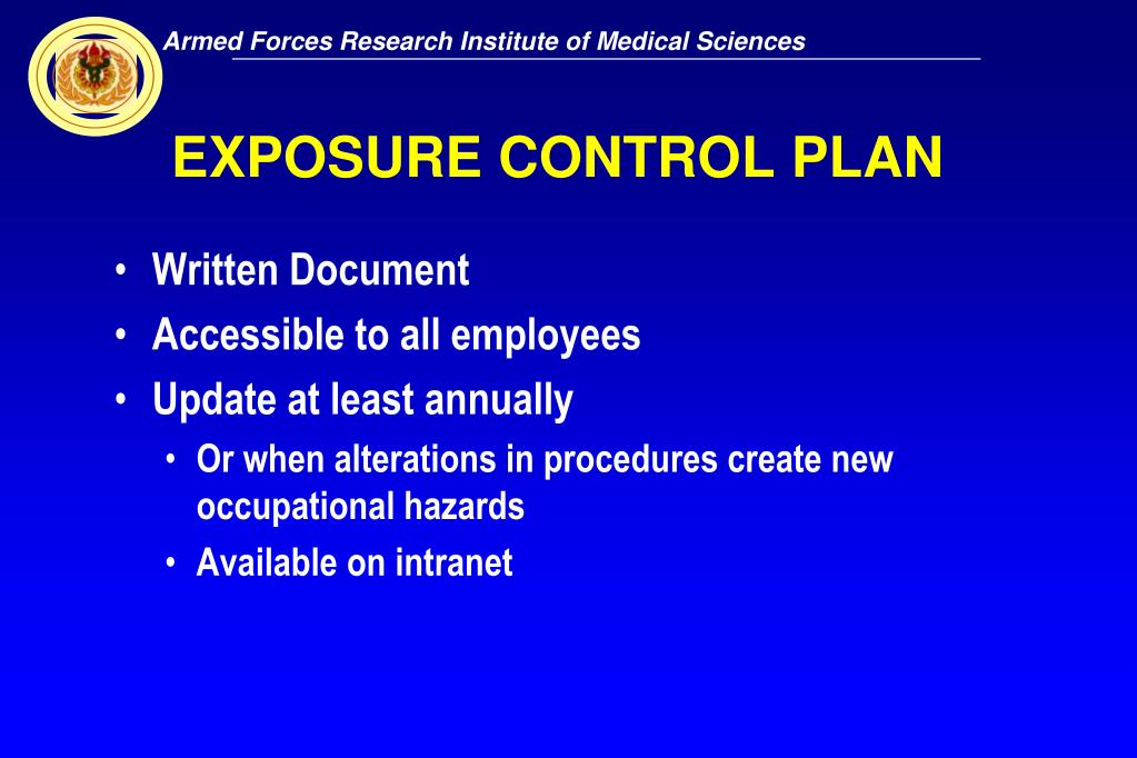 EXPOSURE CONTROL PLAN • Written Document • Accessible to all employees • Update at least annually • Or when alterations in procedures create new occupational hazards • Available on intranet