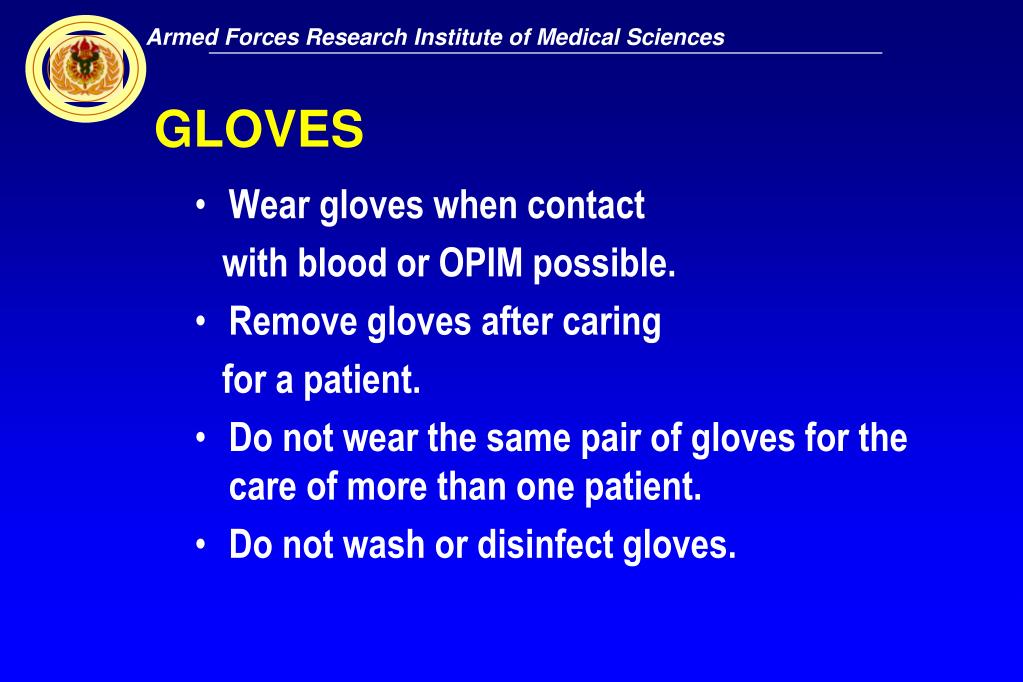 GLOVES • Wear gloves when contact with blood or OPIM possible. • Remove gloves after caring for a patient. • Do not wear the same pair of gloves for the care of more than one patient. • Do not wash or disinfect gloves.