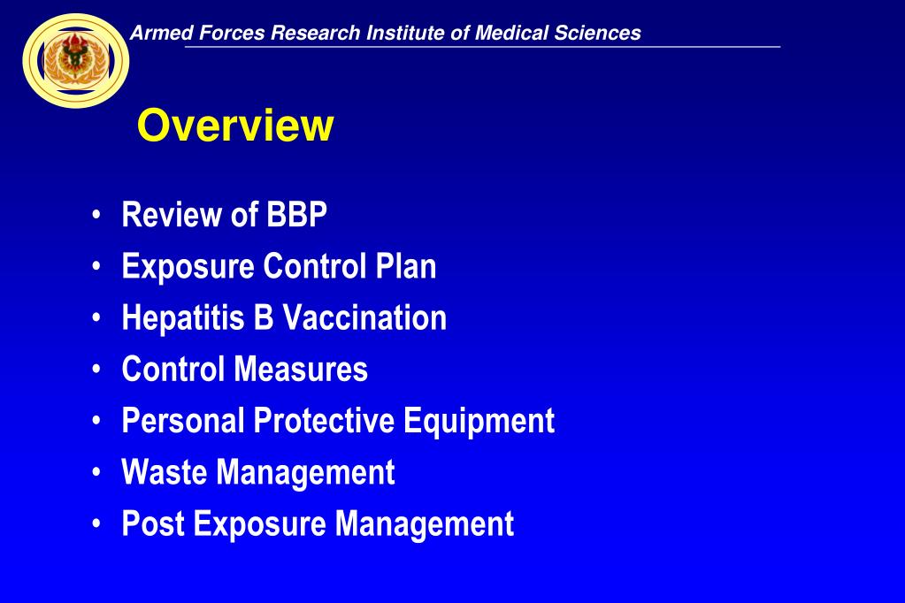 Overview • Review of BBP • Exposure Control Plan • Hepatitis B Vaccination • Control Measures • Personal Protective Equipment • Waste Management • Post Exposure Management