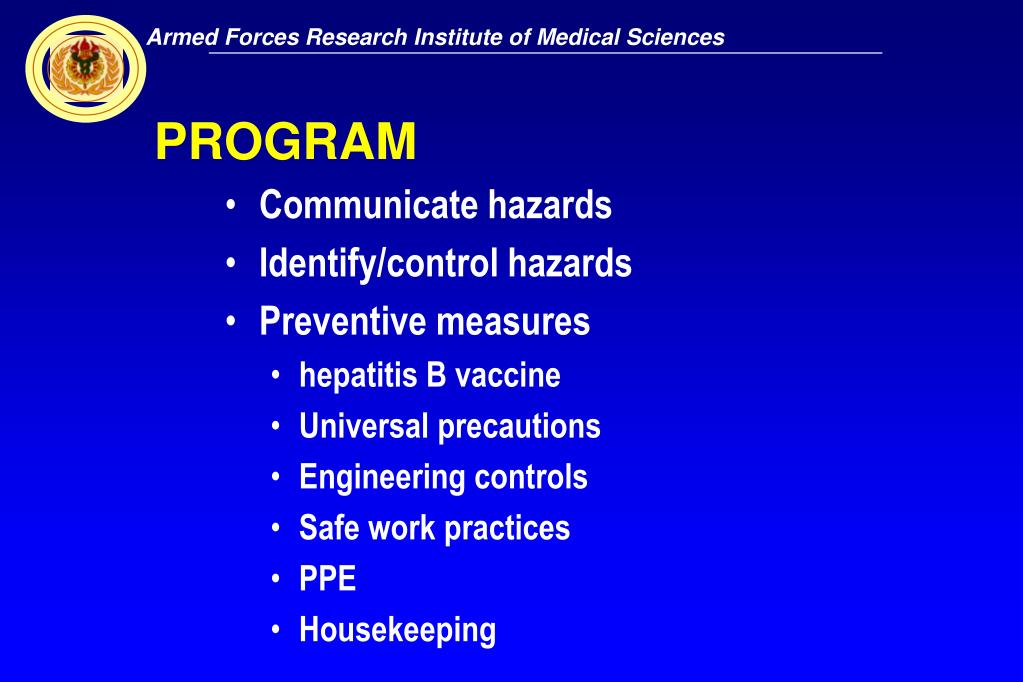 PROGRAM • Communicate hazards • Identify/control hazards • Preventive measures • hepatitis B vaccine • Universal precautions • Engineering controls • Safe work practices • PPE • Housekeeping