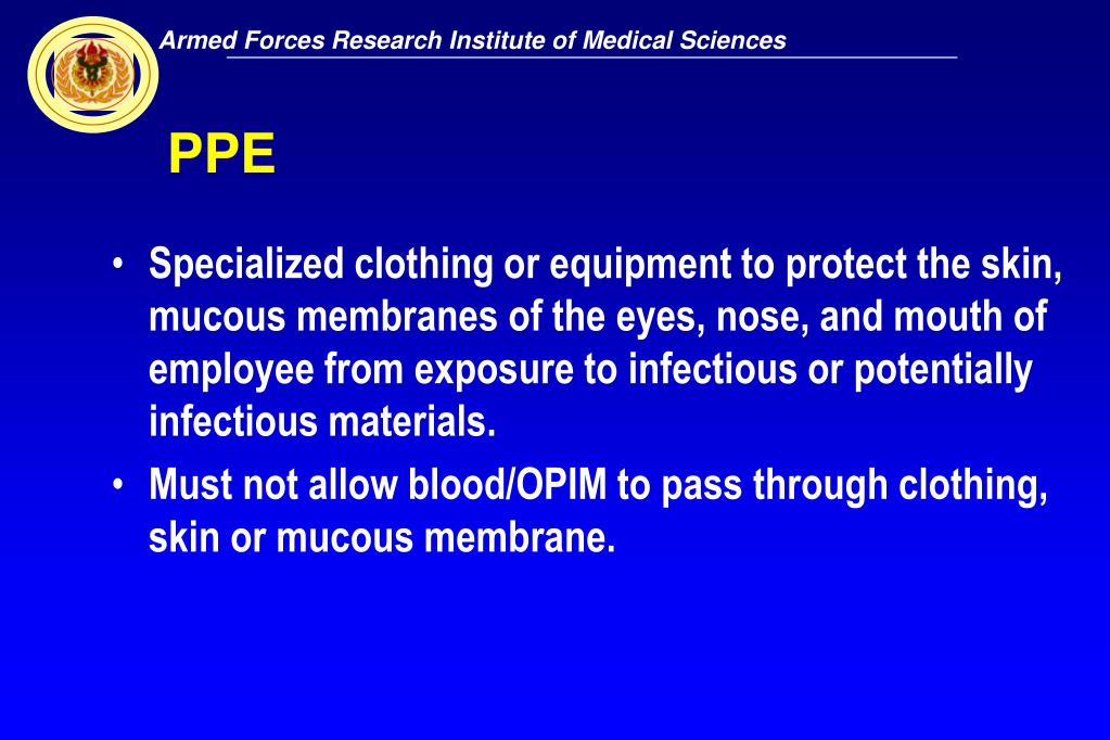 PPE • Specialized clothing or equipment to protect the skin, mucous membranes of the eyes, nose, and mouth of employee from exposure to infectious or potentially infectious materials. • Must not allow blood/OPIM to pass through clothing, skin or mucous membrane.