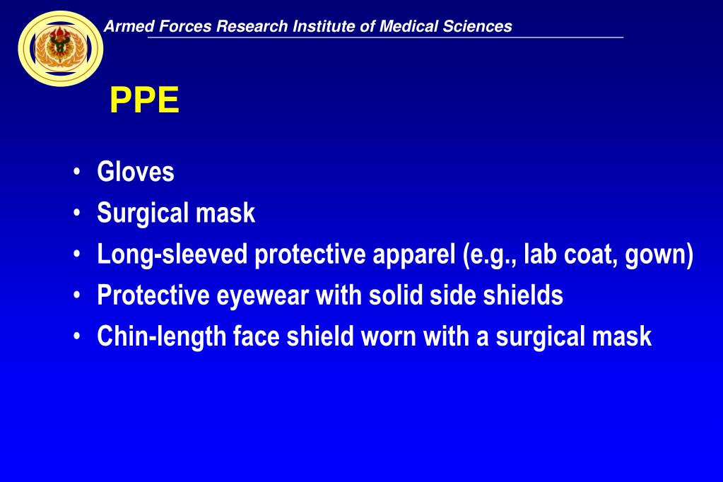 PPE • Gloves • Surgical mask • Long-sleeved protective apparel (e.g., lab coat, gown) • Protective eyewear with solid side shields • Chin-length face shield worn with a surgical mask