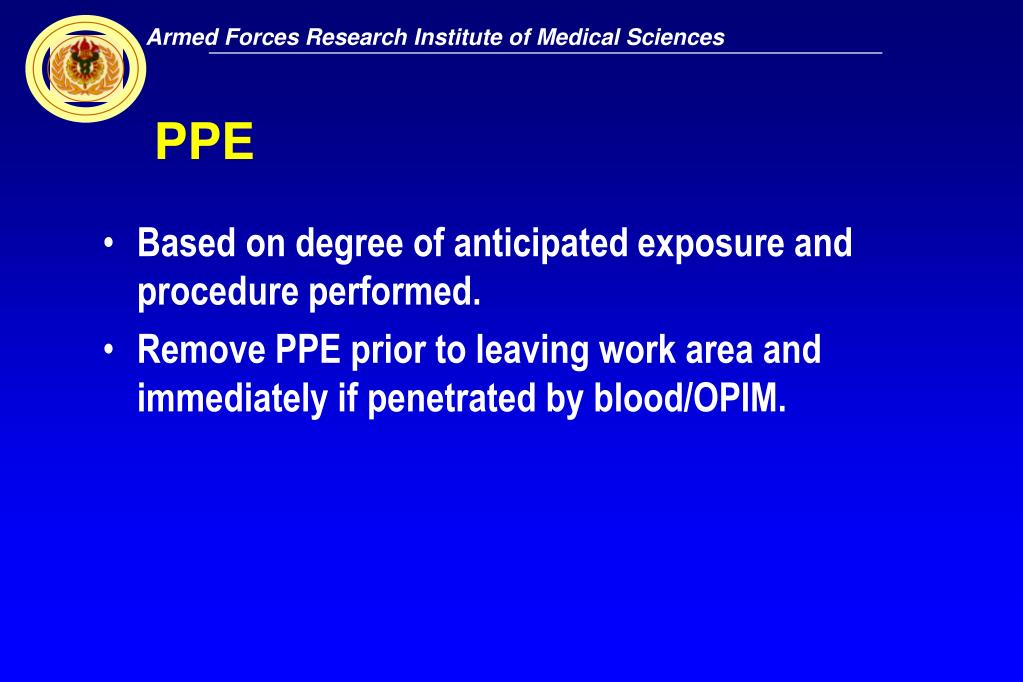 PPE • Based on degree of anticipated exposure and procedure performed. • Remove PPE prior to leaving work area and immediately if penetrated by blood/OPIM.