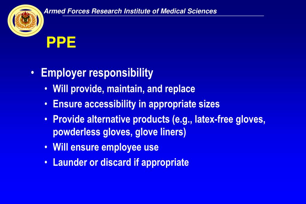 PPE • Employer responsibility • Will provide, maintain, and replace • Ensure accessibility in appropriate sizes • Provide alternative products (e.g., latex-free gloves, powderless gloves, glove liners) • Will ensure employee use • Launder or discard if appropriate