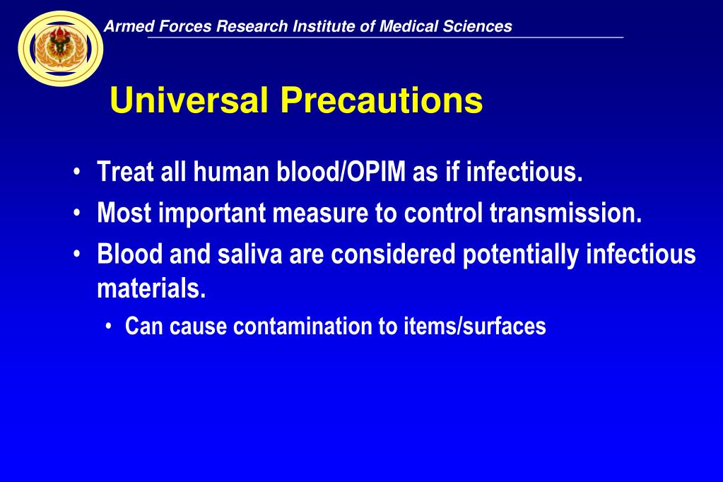 Universal Precautions • Treat all human blood/OPIM as if infectious. • Most important measure to control transmission. • Blood and saliva are considered potentially infectious materials. • Can cause contamination to items/surfaces
