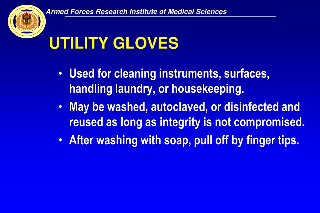 UTILITY GLOVES • Used for cleaning instruments, surfaces, handling laundry, or housekeeping. • May be washed, autoclaved, or disinfected and reused as long as integrity is not compromised. • After washing with soap, pull off by finger tips.