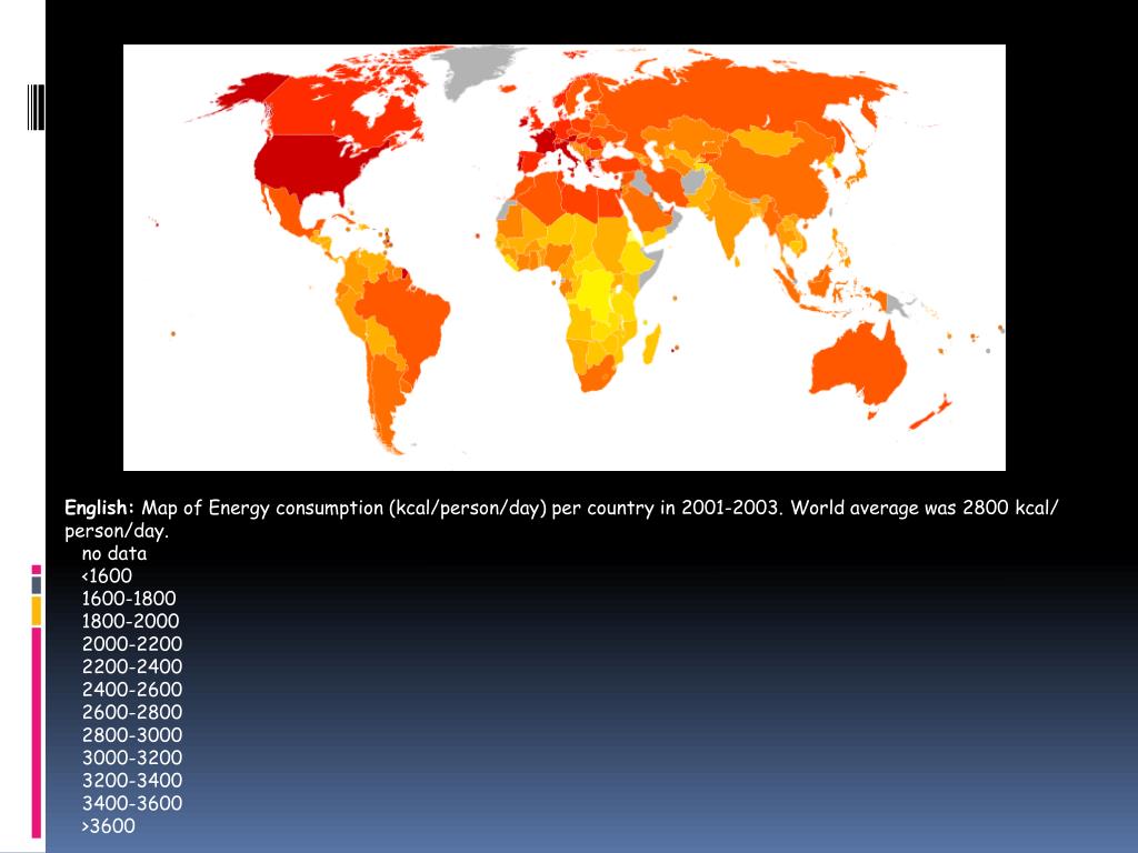 English: Map of Energy consumption (kcal/person/day) per country in 2001-2003. World average was 2800 kcal/ person/day. no data <1600 1600-1800 1800-2000 2000-2200 2200-2400 2400-2600 2600-2800 2800-3000 3000-3200 3200-3400 3400-3600 >3600