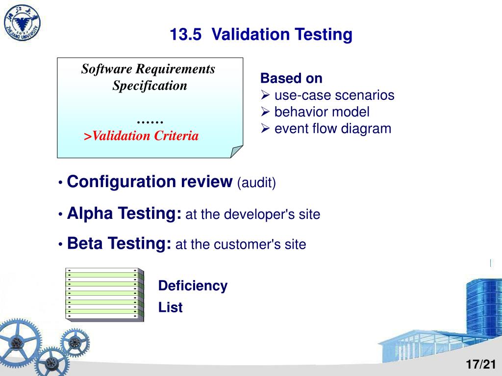 Deficiency List 13.5 Validation Testing Software Requirements Specification …… >Validation Criteria • Based on • use-case scenarios • behavior model • event flow diagram • Configuration review(audit) • Alpha Testing:at the developer's site • Beta Testing:at the customer's site 17/21