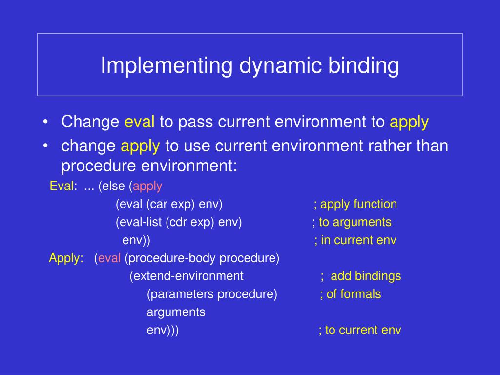 Implementing dynamic binding • Change eval to pass current environment to apply • change apply to use current environment rather than procedure environment: Eval: ... (else (apply (eval (car exp) env) ; apply function (eval-list (cdr exp) env) ; to arguments env)) ; in current env Apply: (eval (procedure-body procedure) (extend-environment ; add bindings (parameters procedure) ; of formals arguments env))) ; to current env