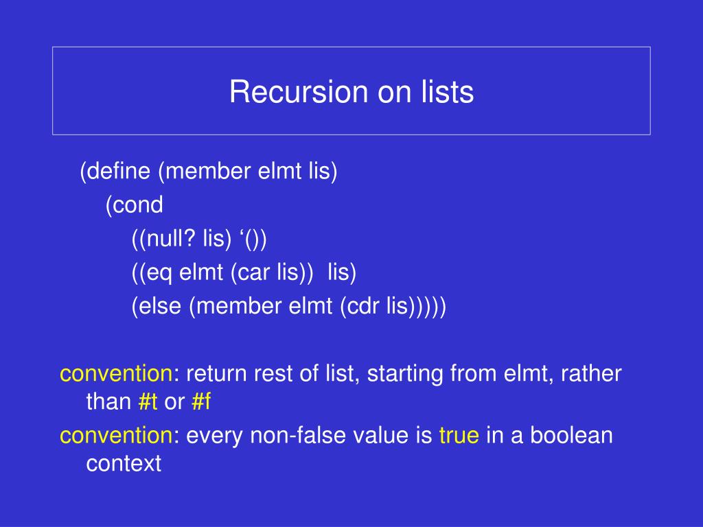 Recursion on lists (define (member elmt lis) (cond ((null? lis) ‘()) ((eq elmt (car lis)) lis) (else (member elmt (cdr lis))))) convention: return rest of list, starting from elmt, rather than #t or #f convention: every non-false value is true in a boolean context