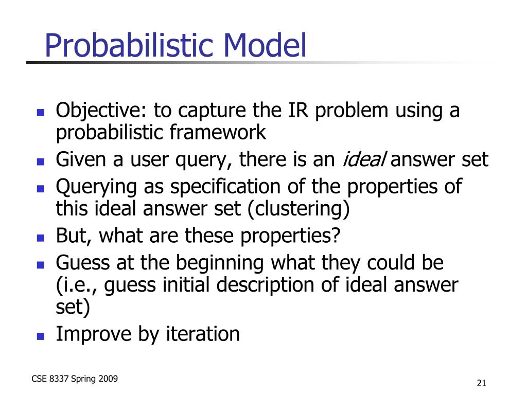 Probabilistic Model • Objective: to capture the IR problem using a probabilistic framework • Given a user query, there is an ideal answer set • Querying as specification of the properties of this ideal answer set (clustering) • But, what are these properties? • Guess at the beginning what they could be (i.e., guess initial description of ideal answer set) • Improve by iteration
