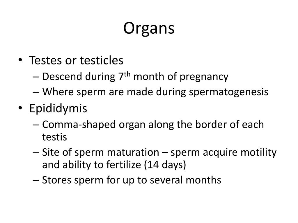 Organs • Testes or testicles • Descend during 7th month of pregnancy • Where sperm are made during spermatogenesis • Epididymis • Comma-shaped organ along the border of each testis • Site of sperm maturation – sperm acquire motility and ability to fertilize (14 days) • Stores sperm for up to several months