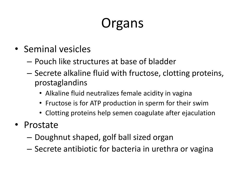 Organs • Seminal vesicles • Pouch like structures at base of bladder • Secrete alkaline fluid with fructose, clotting proteins, prostaglandins • Alkaline fluid neutralizes female acidity in vagina • Fructose is for ATP production in sperm for their swim • Clotting proteins help semen coagulate after ejaculation • Prostate • Doughnut shaped, golf ball sized organ • Secrete antibiotic for bacteria in urethra or vagina