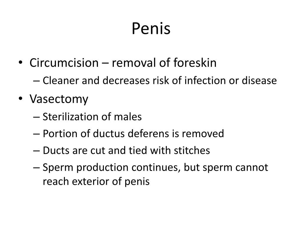 Penis • Circumcision – removal of foreskin • Cleaner and decreases risk of infection or disease • Vasectomy • Sterilization of males • Portion of ductus deferens is removed • Ducts are cut and tied with stitches • Sperm production continues, but sperm cannot reach exterior of penis