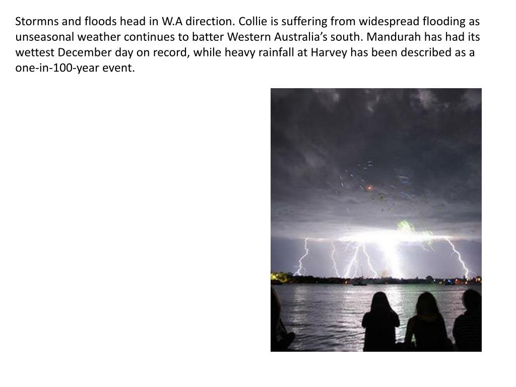 Stormns and floods head in W.A direction. Collie is suffering from widespread flooding as unseasonal weather continues to batter Western Australia’s south. Mandurah has had its wettest December day on record, while heavy rainfall at Harvey has been described as a one-in-100-year event.
