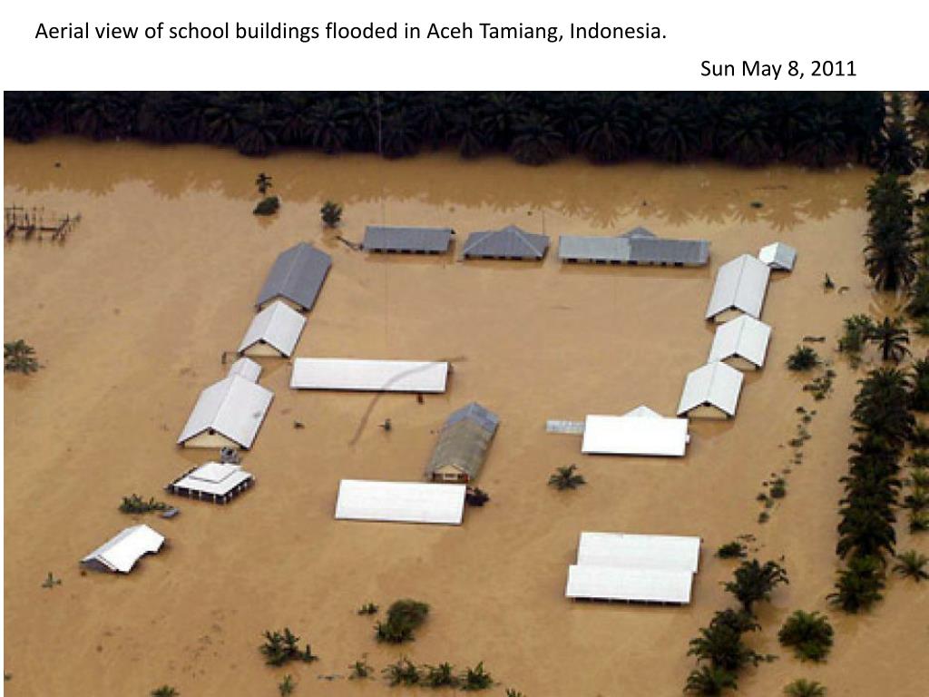 Aerial view of school buildings flooded in Aceh Tamiang, Indonesia. Sun May 8, 2011