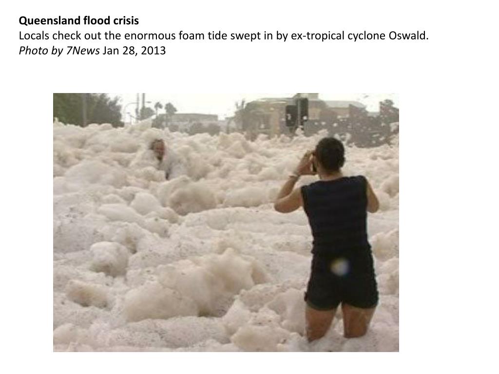 Queensland flood crisis Locals check out the enormous foam tide swept in by ex-tropical cyclone Oswald. Photo by 7News Jan 28, 2013