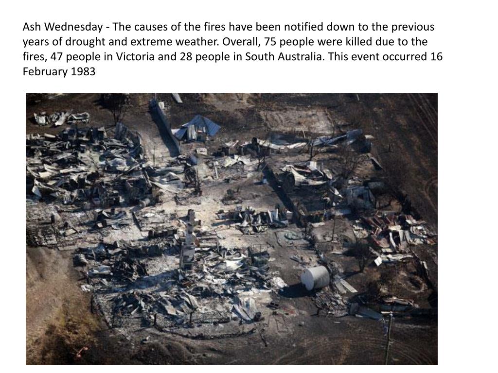Ash Wednesday - The causes of the fires have been notified down to the previous years of drought and extreme weather. Overall, 75 people were killed due to the fires, 47 people in Victoria and 28 people in South Australia. This event occurred 16 February 1983