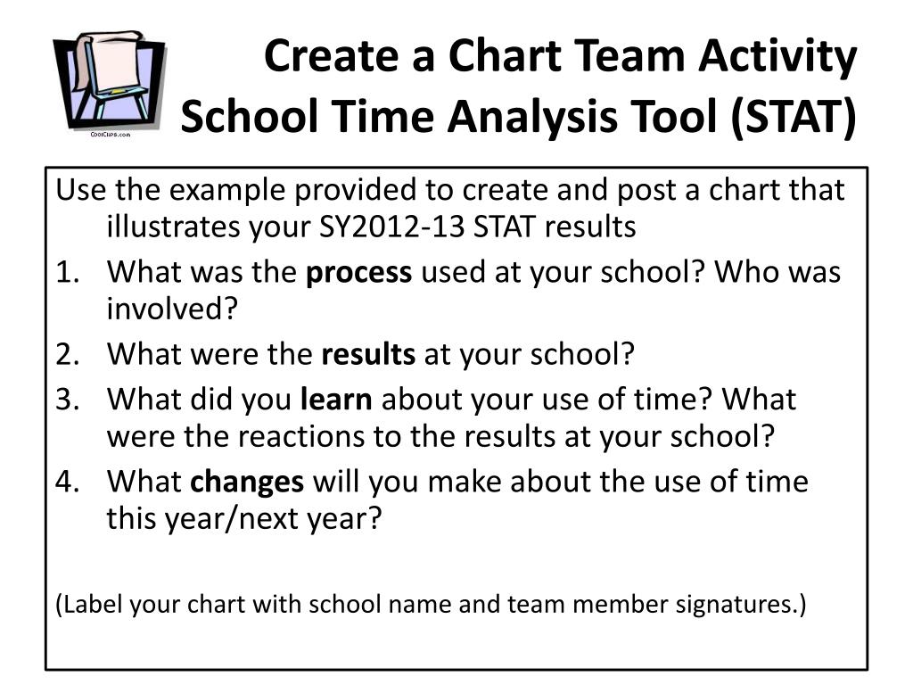 Create a Chart Team ActivitySchool Time Analysis Tool (STAT) Use the example provided to create and post a chart that illustrates your SY2012-13 STAT results • What was the process used at your school? Who was involved? • What were the results at your school? • What did you learn about your use of time? What were the reactions to the results at your school? • What changes will you make about the use of time this year/next year? (Label your chart with school name and team member signatures.)