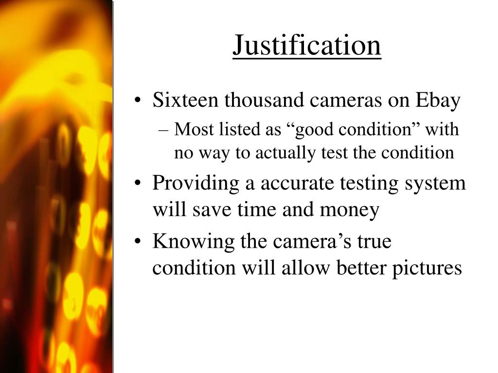 Justification • Sixteen thousand cameras on Ebay • Most listed as “good condition” with no way to actually test the condition • Providing a accurate testing system will save time and money • Knowing the camera’s true condition will allow better pictures