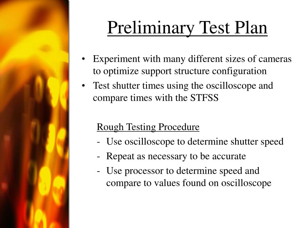 Preliminary Test Plan • Experiment with many different sizes of cameras to optimize support structure configuration • Test shutter times using the oscilloscope and compare times with the STFSS Rough Testing Procedure • Use oscilloscope to determine shutter speed • Repeat as necessary to be accurate • Use processor to determine speed and compare to values found on oscilloscope