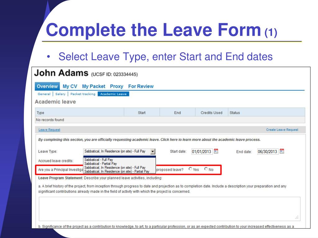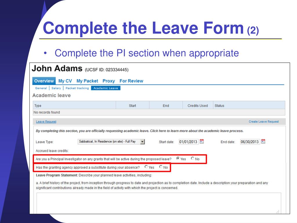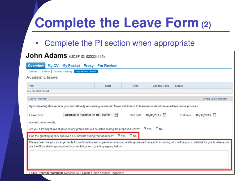 Complete the Leave Form (2) • Complete the PI section when appropriate